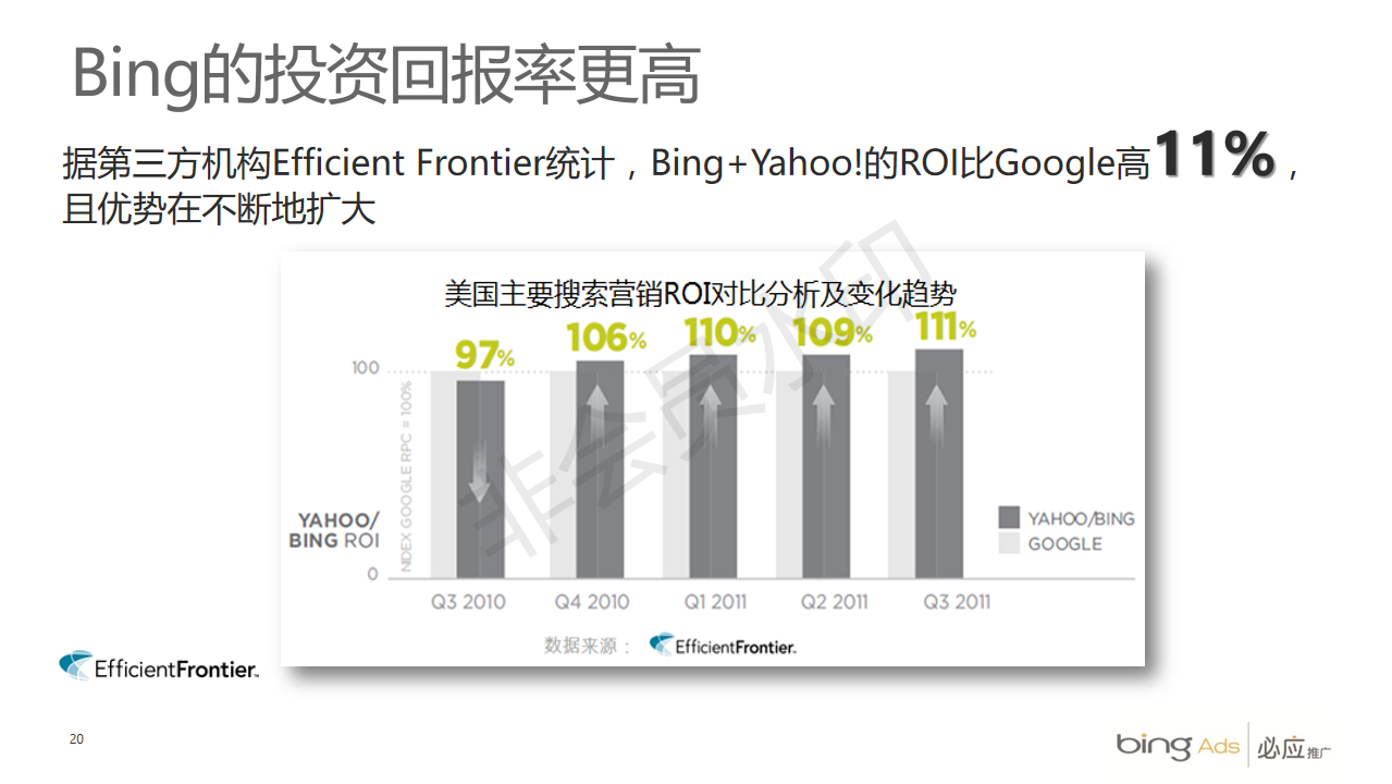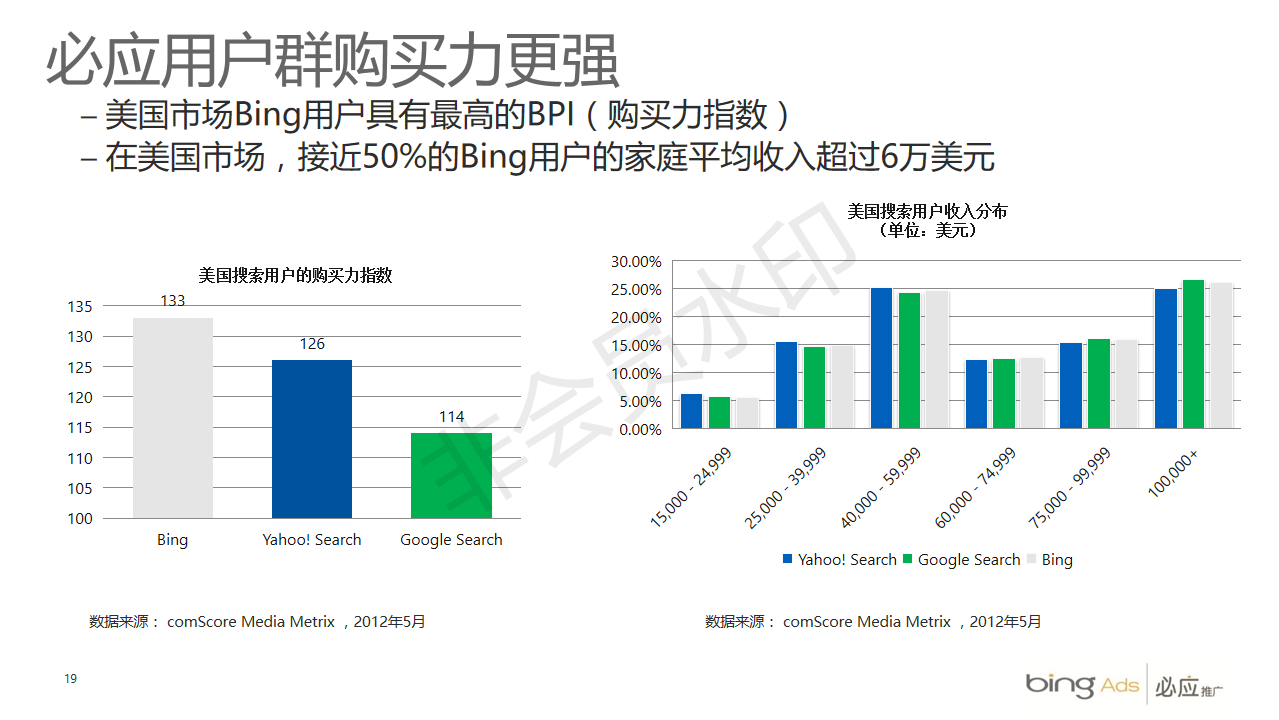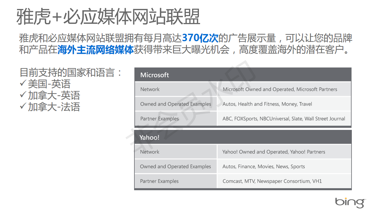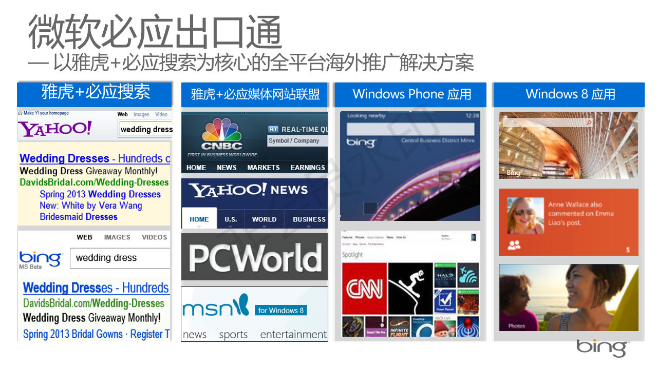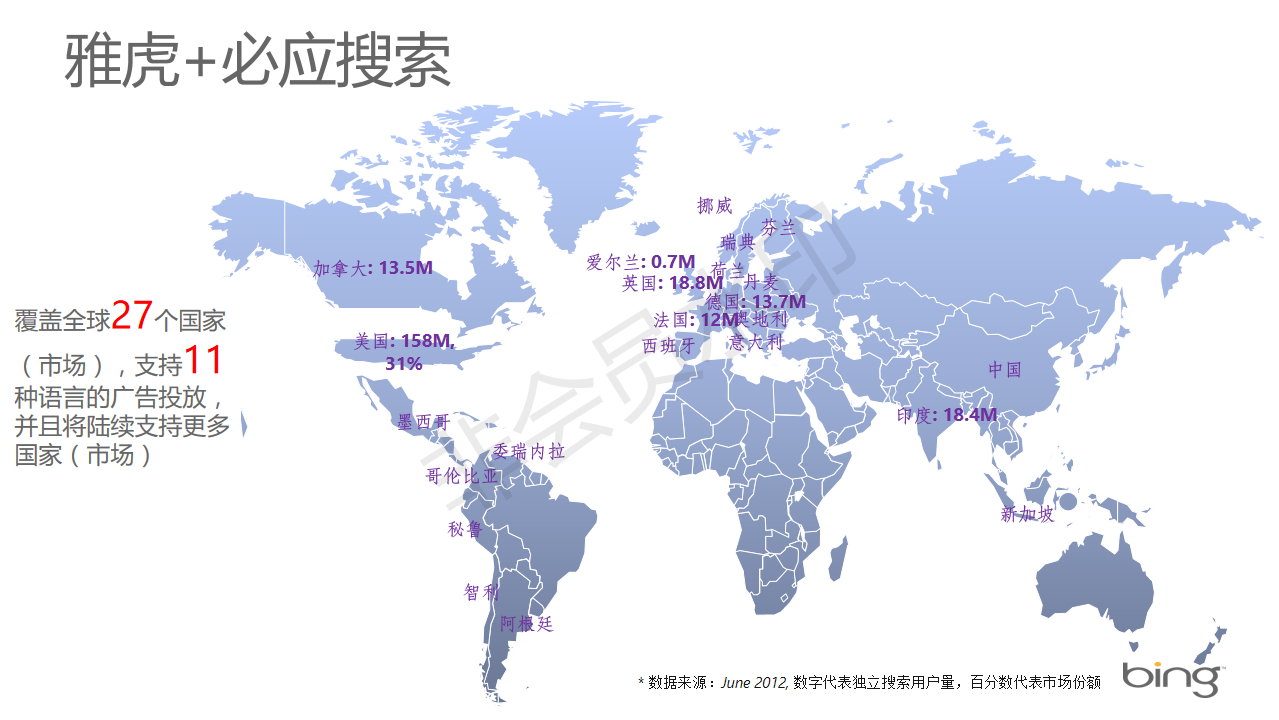 微软必应(Bing)广告推广是全球第二大搜索引擎,超过拥有6亿高购买用户,35%美国PC端市场份额。微软广告,以基于必应的搜索广告为核心,2004年至今,为包括中国国际航空公司、阿里巴巴和携程在内6000+家出海企业提供海外推广服务。