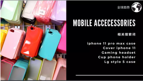 对于手机及配饰品类,相关搜索词围绕新上市的iphone11,LG stylo 5手机壳,以及游戏耳机和车载杯式手机架。