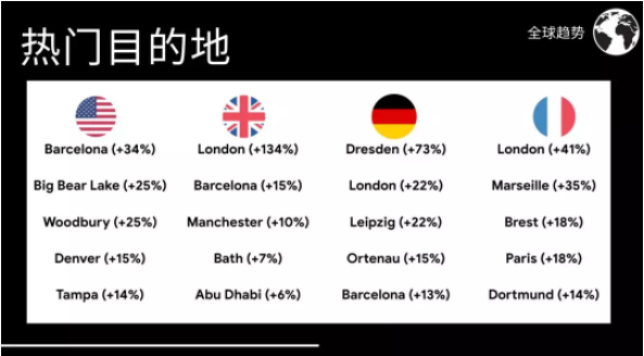 圣诞节向来是旅行的好时节,热门的搜索词主要会集中在Beaches & islands (沙滩和海岛) ,Winter travel destinations (适合冬季旅行的目的地)和Vacation packages(旅行套餐)。其中针对美国,英国,德国和法国的热门目的地有以下一些城市: