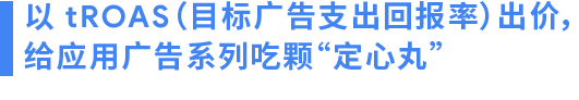 又名 AC for Value,tROAS 旨在让广告主们设定目标支出回报率,AC 应用广告便会在转化窗口期内(建议 7 天),找到那些大有可能完成特定应用内事件操作的用户和玩家,确保广告的转化回报。如果您的应用以优化用户的长期价值(LTV)为目标,希望带动应用内操作,如:完成付费事件、购买道具等来赢得收益增长,别犹豫,tROAS 会是为您实现高效回报率的“优选”出价策略。上手前,需通过 GA4F 事件进行出价。如果您符合该条件,请联络谷歌客户经理开通白名单尝鲜吧。