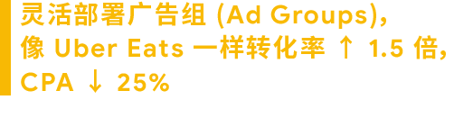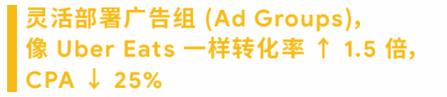 作为同时面向食客、餐厅和配送司机的一款应用,Uber Eats 想要通过 App campaigns 增获其有效订单量,尝试不同的折扣力度对于吸引订单的作用。通过与 Google 广告团队合作,选用了新上线的“广告组(Ad Groups)”功能,将不同优惠的广告素材分组投放。这一举措帮助 Uber Eats 应用广告的 CPA 降低了 25%,而转化率提升了 1.5 倍。
