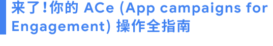 据 AppsFlyer 2019 复盘数据,尤其对于游戏应用来说,针对既有/高意向用户的再营销,是为跃增游戏活力和营收的有效手段。对于向付费用户投放再营销广告活动的游戏应用,其平均收入增长超过 50%,是行业平均水平的两倍以上。而 ACe 正是吻合该需求的拳头产品,帮助广告主透过高关联度讯息,吸引“老玩家”重返您的游戏,并更有可能深入互动游玩,乃至付费。大体来说,ACe 可分为以下步骤来布局: