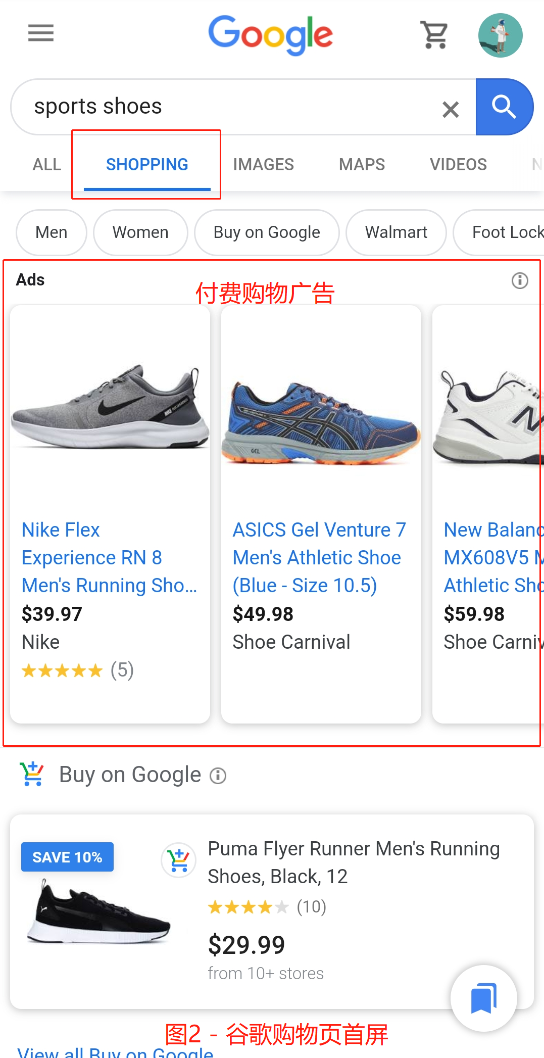 现在在美国搜索商品,已经能看到新的页面了。在谷歌中搜索“sports shoes”,谷歌网页显示的搜索结果页,付费的购物广告仍然出现在页面最上方(见图1)。