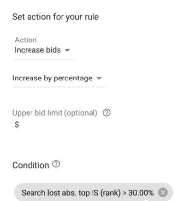 如下图:当因排名差而丢失的绝对页首展示份额大于 30%,就自动提高出价。也可使用 tROAS 或 tCPA,增加广告排名和展示次数份额百分比。最好在 Google 广告中启动实验,以查看调整出价规则如何影响效果。
