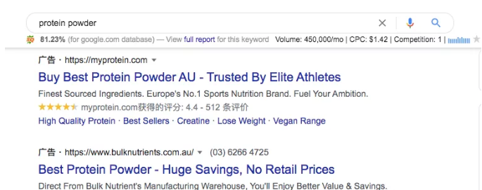 假如说美国的某个运动爱好者,有一天想买蛋白粉,在谷歌上搜索了protein powder,然后看到了咱们的广告。