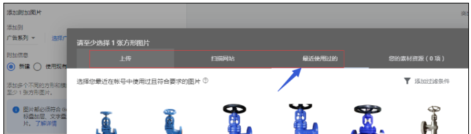 ● 使用现有的:从您账号的任意广告系列或广告组中选择现有的附加图片。