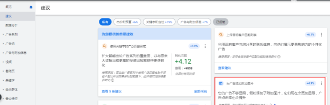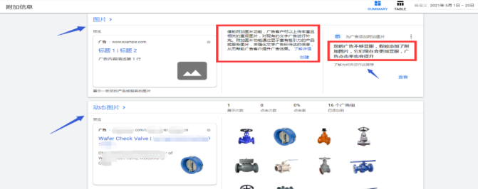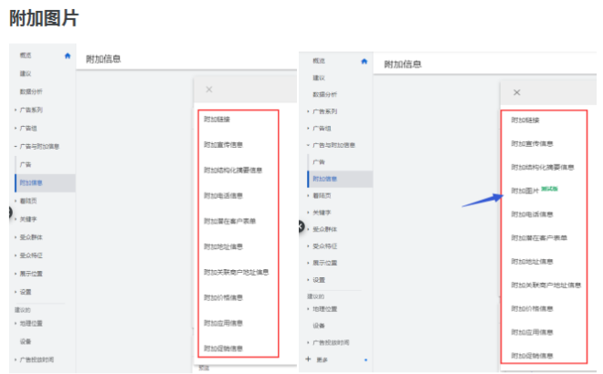 附加图片功能和动态图片附加信息目前都处于 Beta 版,可能不会面向所有 Google Ads 用户提供。查看标准是附加信息列、建议里面是否有新增的附加图片或动态图片附加信息,如下图对比所示: