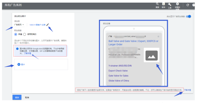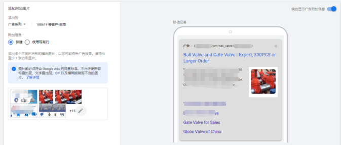 登录Google Ads账号后,在左侧的页面菜单中,点击广告与附加信息,点击加号按钮 ,然后选择附加图片。