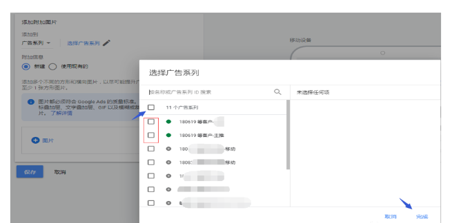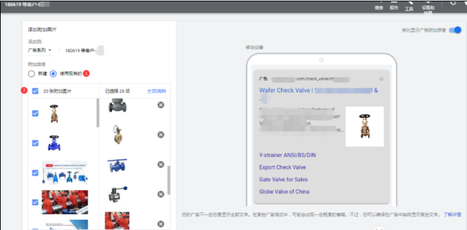 下图是刚创建附加图片时只选择了一个广告系列,在其他广告系列下面选择使用现有的附加图片的情况截图,直接全选20张图片点击保存即可: