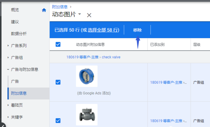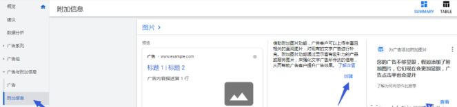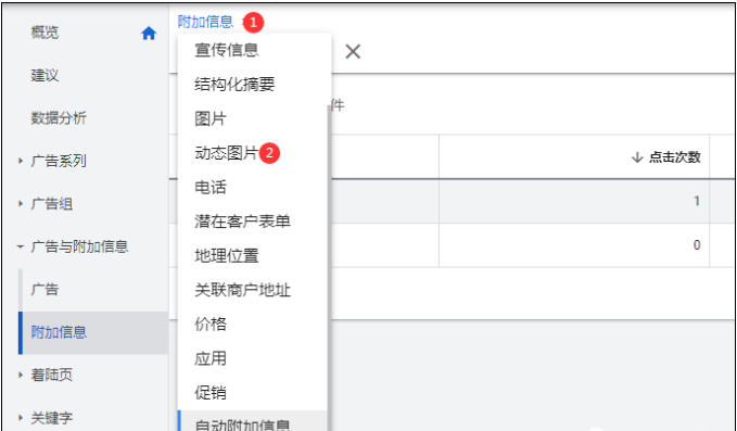 ● 登录Google Ads账号后,和添加附加图片一样在左侧的页面菜单中,点击广告与附加信息。