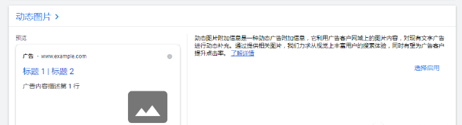 动态图片附加信息是一种自动附加信息,可让Google从广告的着陆页中挑选相关的影像,作为对现有搜索广告的补充。动态图片附加信息可通过显示富有吸引力的产品或服务影像来强化文字广告传递的内容,从而帮助您达成效果目标。您可以在账号层级选择启用动态图片附加信息。